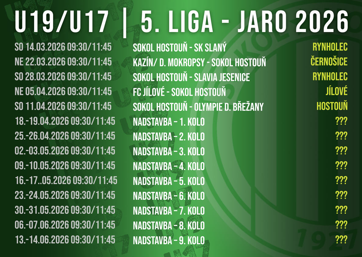 Dorostence Sokola Hostouň čeká v jarní části pět utkání základní části. Nejprve se v sobotu 14. března představí na hřišti v Rynholci proti SK Slaný. Následně zamíří 22. března na hřiště Kazín - Dolní Mokropsy. Poslední domácí březnové utkání odehrají 28. března proti SK Slavia Jesenice. V dubnu čeká Hostouň venkovní zápas v Jílovém (5. dubna) a základní část uzavře domácí dohrávka proti Olympii Dolní Břežany 11. dubna.