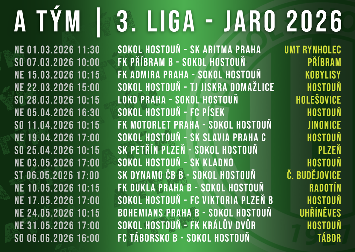 Jarní část přinese kombinaci zkušených třetiligových celků i ambiciózních rezerv prvoligových klubů. Klíčem bude stabilita výkonů, zvládání venkovních utkání a maximální bodový zisk v domácím prostředí. Sokol Hostouň vstupuje do jara s jasným cílem – navázat na podzimní práci a posunout se tabulkou vzhůru. Fanoušci se mohou těšit na atraktivní soupeře i tradiční domácí atmosféru v Hostouni.