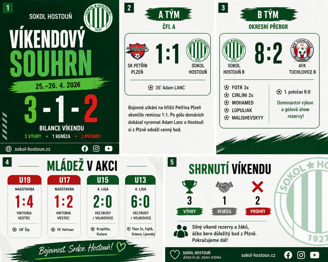 Uplynulý víkend přinesl týmům Sokola Hostouň výsledkově pestrou bilanci. Z šesti odehraných utkání si Hostouň připsala tři vítězství, jednu remízu a dvě porážky. A tým vybojoval bod na hřišti Petřína Plzeň, rezerva předvedla ofenzivní koncert a rozstřílela Tuchlovice, zatímco žákovské kategorie potvrdily svou kvalitu dvěma přesvědčivými výhrami. Naopak dorostenecké týmy proti lídrovi vyšly bodově naprázdno, přesto v obou případech nebyly daleko lepším výsledkům.
