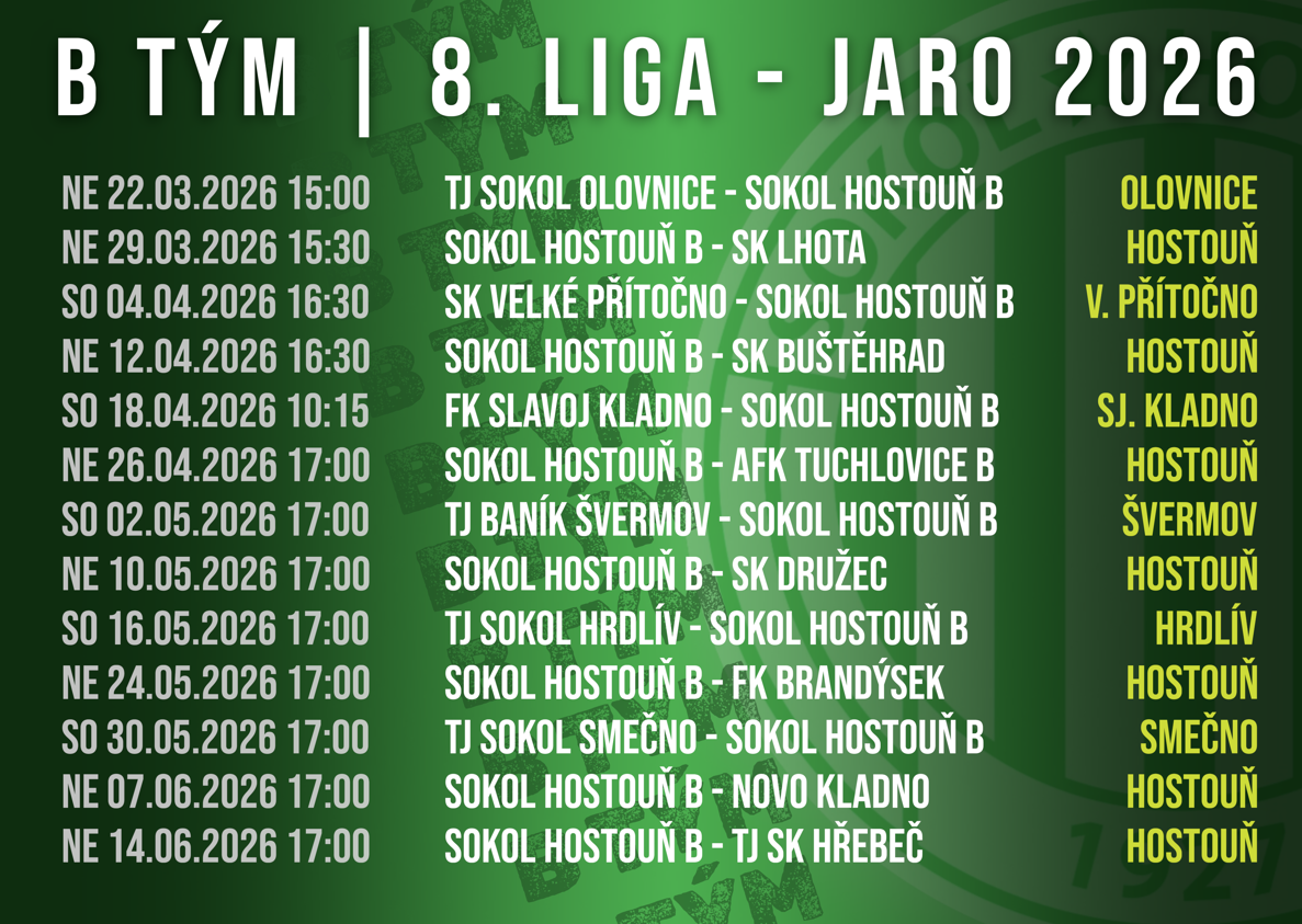 Odvetná část soutěže začne pro Sokol Hostouň B v neděli 22. března, kdy se představí na hřišti TJ Sokol Olovnice. O týden později čeká hostouňský tým první domácí utkání jara, když na stadionu v Hostouni přivítá SK Lhotu. Následně se rezerva Sokola představí na hřišti Velkého Přítočna, po kterém bude následovat domácí duel proti Buštěhradu. V polovině dubna čeká Hostouň zajímavý zápas na hřišti Slavoje Kladno.